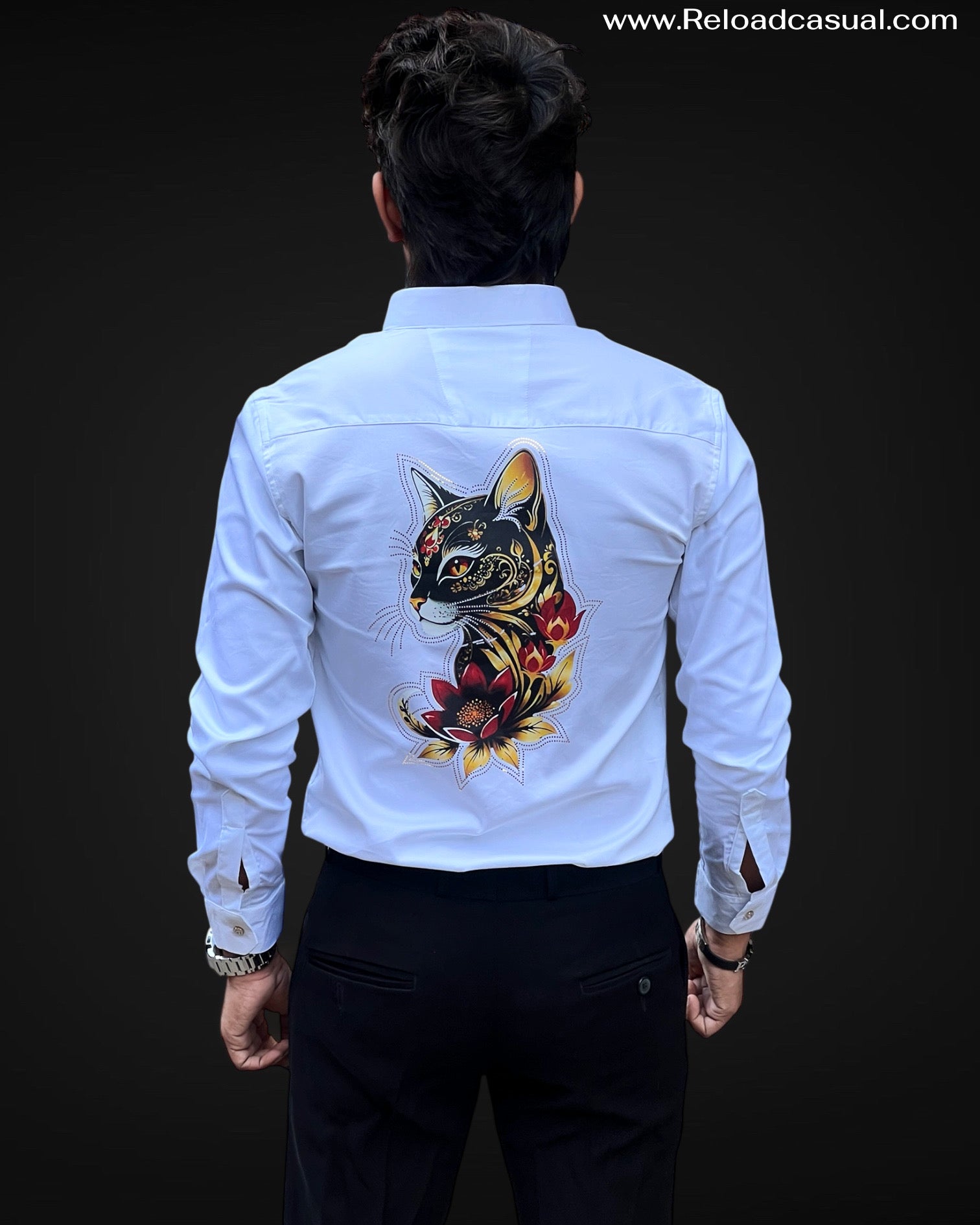 This collection features stylish long-sleeve shirts available in classic black and sharp white options, each adorned with a striking cat embroidery accented by vibrant floral designs on both the chest and back. The shirts are tailored for a modern fit, combining comfort with bold artistic flair, making them perfect for both casual and semi-formal occasions. The sophisticated pattern and meticulous embroidery offer a unique statement piece for anyone seeking to stand out with contemporary fashion.