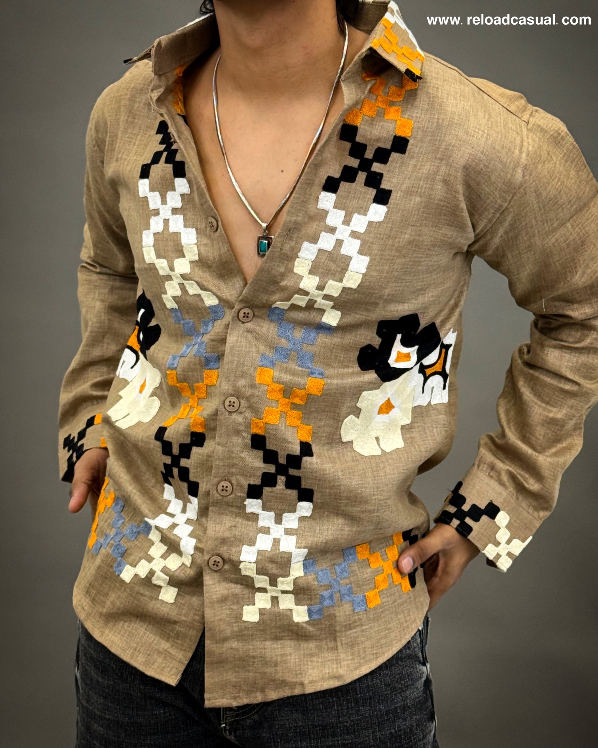 Upgrade your casual style with this Cultural Grid Embroidered Shirt from Reload Casual. Made from lightweight, breathable fabric, it features unique grid-style embroidery for a stylish ethnic touch. Perfect for casual outings, festive wear, and parties.