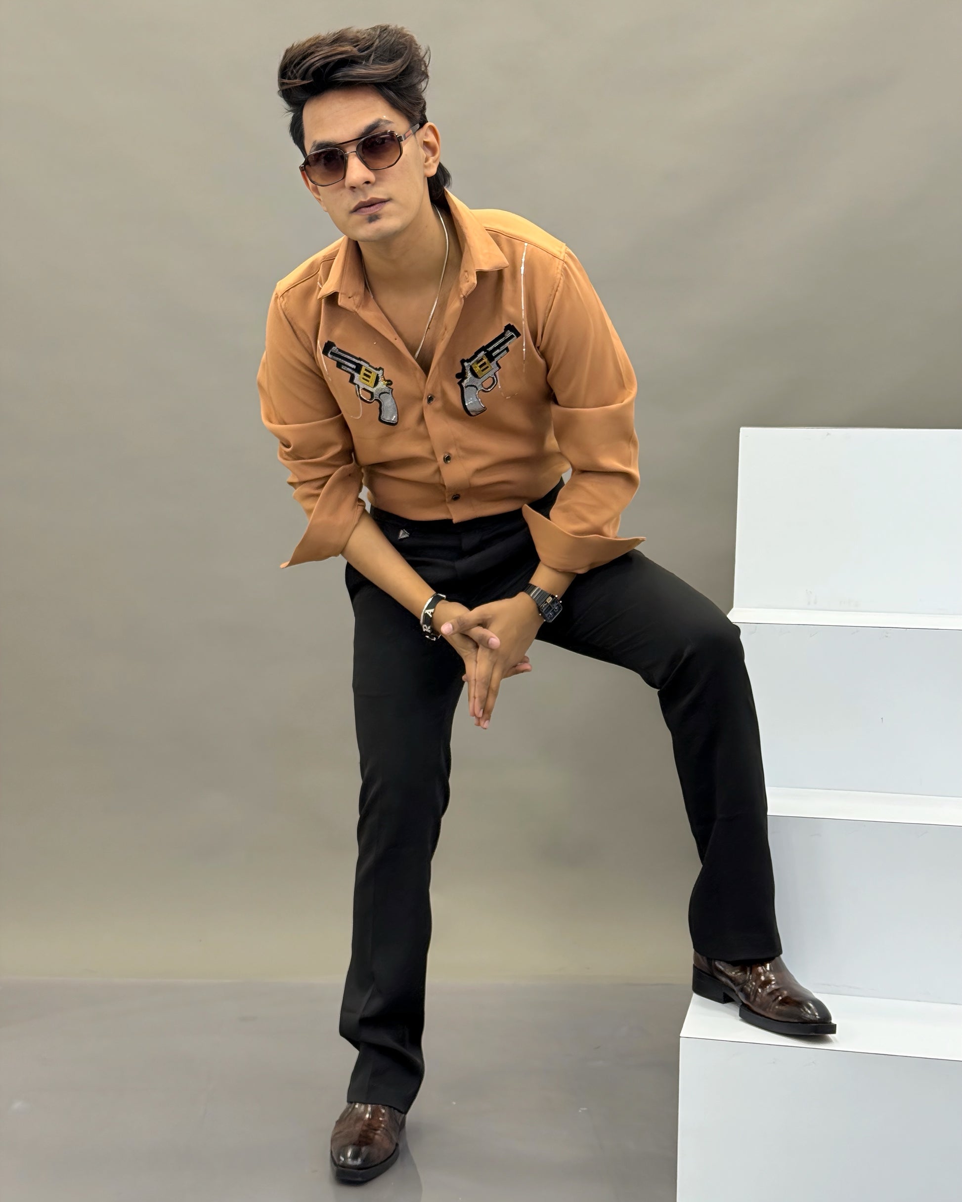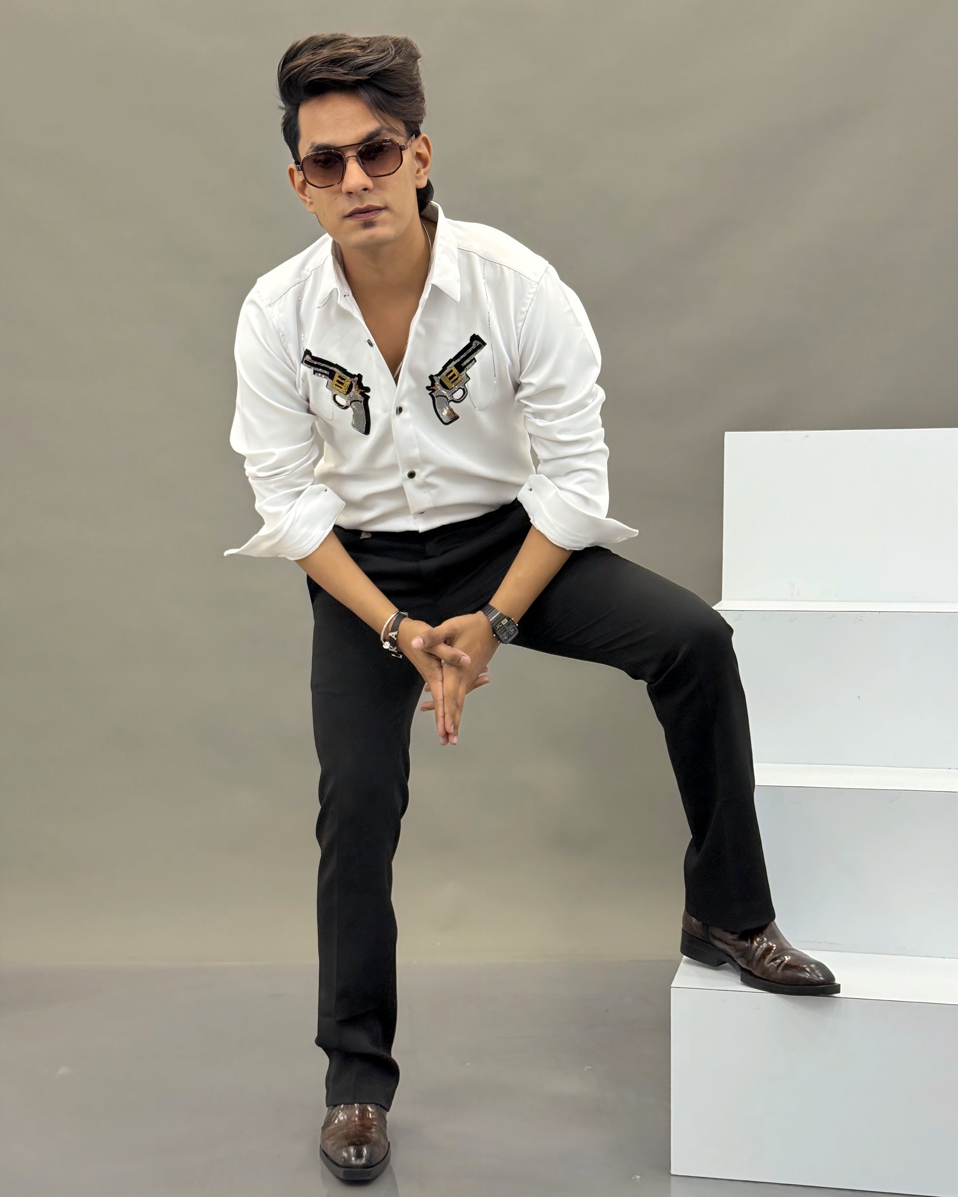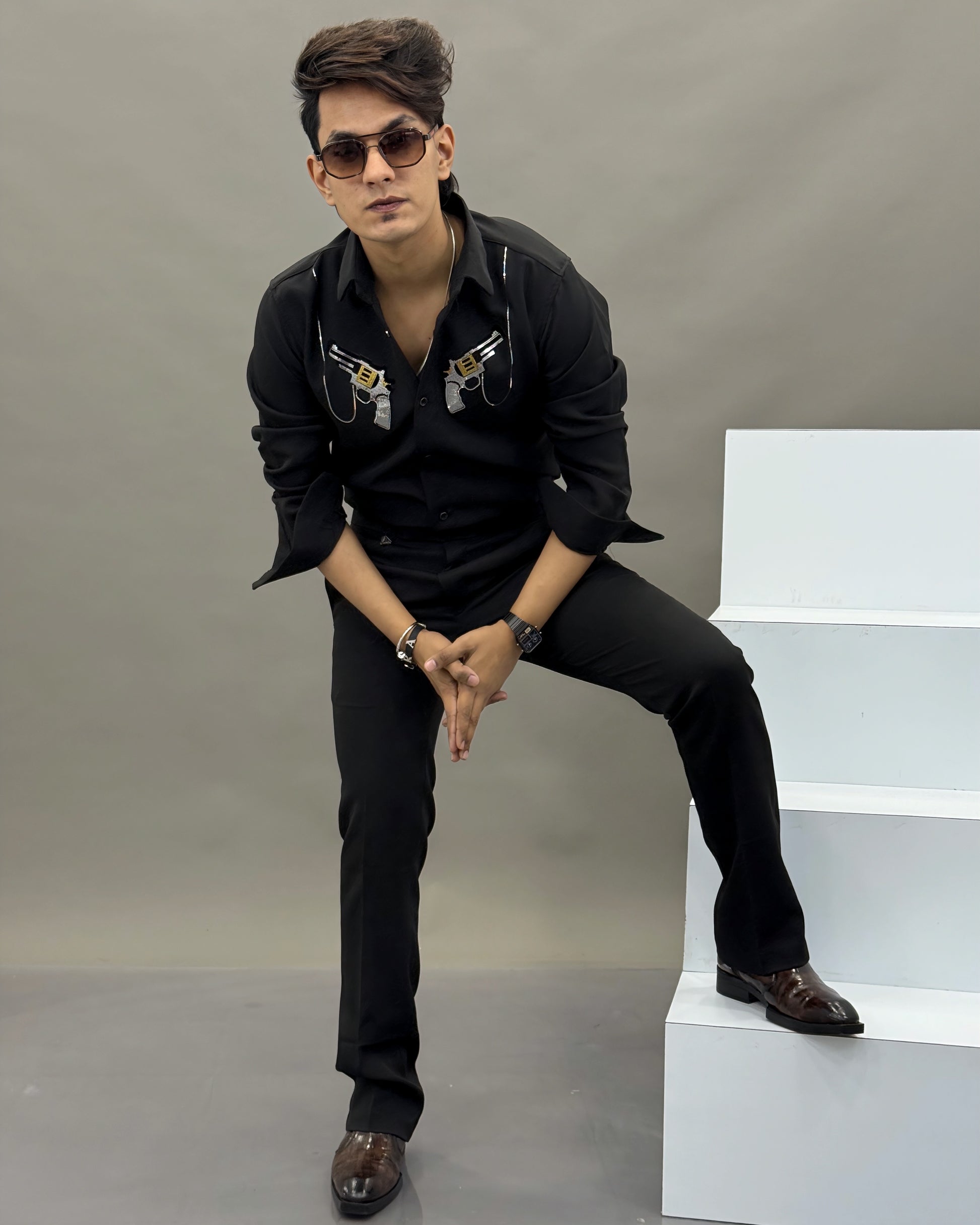 Step into bold luxury with this statement piece from Reload Casual. Designed for men who lead with confidence, this handmade shirt features twin crystal-embellished revolver artwork highlighted with striking golden magazine detailing.