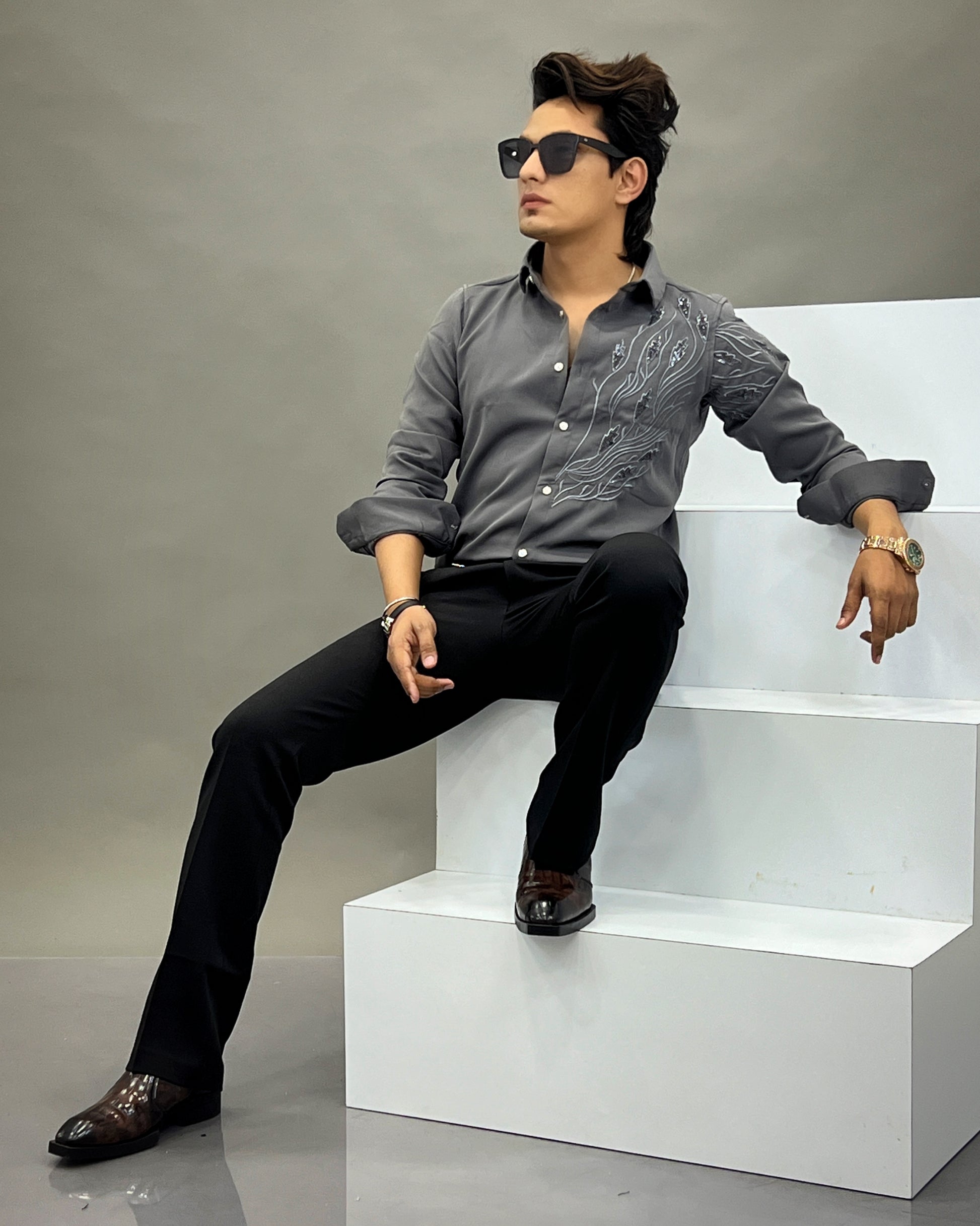 A modern statement shirt highlighted with elegant leaf-inspired embroidery across the shoulder and sleeve. Designed to blend urban sophistication with ethnic artistry, this shirt delivers a sharp silhouette with a refined finish. Perfect for evenings, festive gatherings, or elevated casual wear.